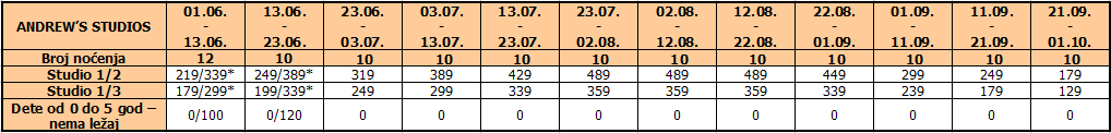 Dvokrevetni/trokrevetni studiji: poseduju adekvatan broj ležajeva, kuhinju, frižider, kupatilo sa tuš/wc, terasu sa garniturom za sedenje. Studiji se nalaze u prizemlju, na prvom i drugom spratu.