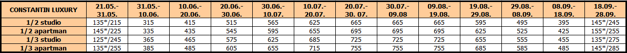 Cene su izražene u eurima po studiju/apartmanu na bazi najma za 10 noćenja
