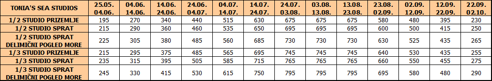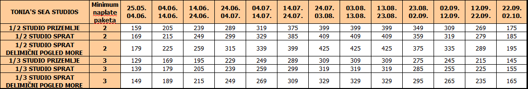 Cene u tabeli su izražene na bazi najma po studiju/apartmanu za 10 noćenja.