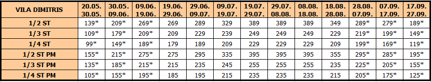 Cene označene zvezdicom* iskazane su po osobi i obuhvataju smeštaj i prevoz. U slučaju sopstvenog prevoza u smenama sa * cena se umanjuje za 20 eur po osobi od ukupne vrednosti aranžmana.