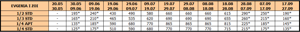 *Cene označene zvezdicom * su cene paket aranžmana u VANSEZONI (uračunat smeštaj i autobuski prevoz iz Niša, bez teritorijalne doplate za prevoz) po osobi.* Teritorijalna doplata za autobuski prevoz severno od Niša: Beograd – 10 evra, Novi Sad – 20 evra