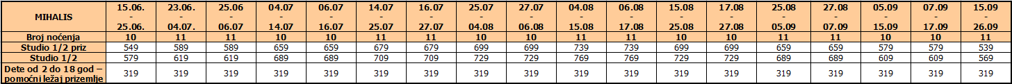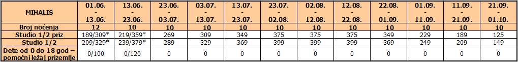 *dete od 2 do 18 godina – plaća iznos iz tabele i ima svoj krevet u std 1/2+1 u pratnji 2 odrasle osobe.