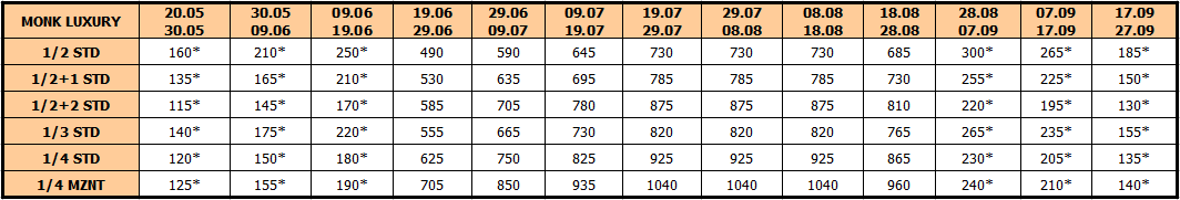 U smenama sa zvezdicom *, u slučaju sopstvenog prevoza cena paket aranžmana se umanjuje za 25€ po osobi.