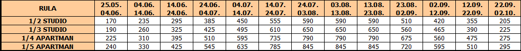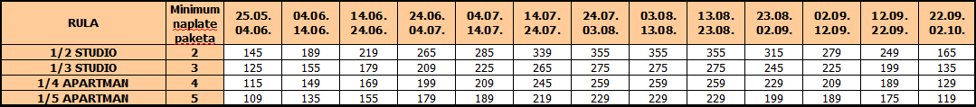 Cene u tabeli su izražene na bazi najma po studiju/apartmanu za 10 noćenja.