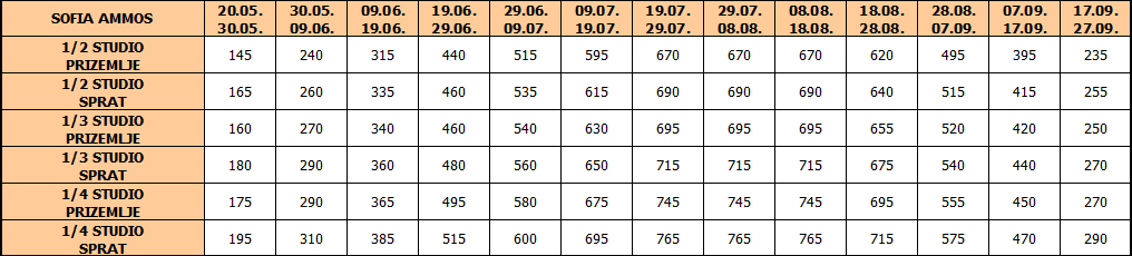 Cene u tabeli su izražene na bazi najma po studiju/apartmanu za 10 noćenja.
