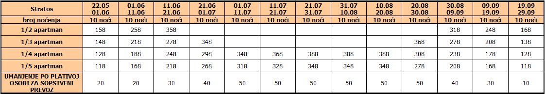 Cene iz tabele predstavljaju cenu paket aranžmana (smeštaj + prevoz) po osobi.