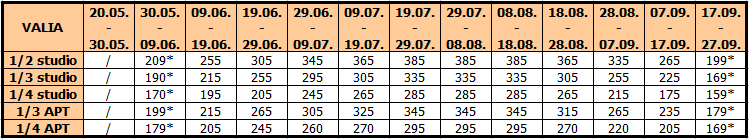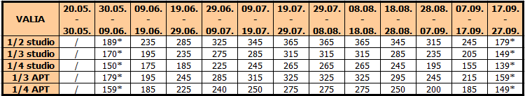 Cene su izražene u evrima po osobi na bazi paket aranžmana (prevoz + smeštaj) za 10 noćenja