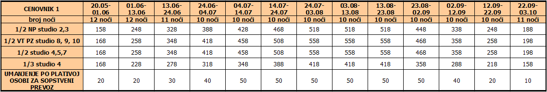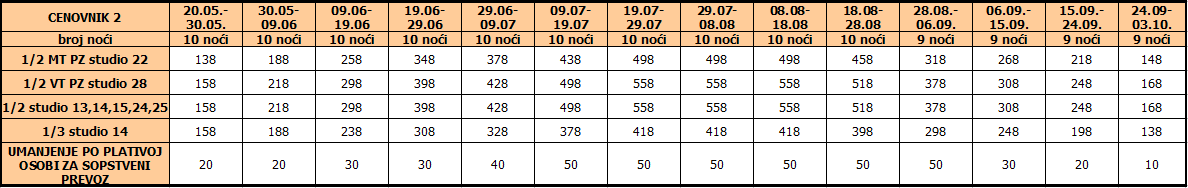CENOVNIK LETO 2026. – 10 NOĆENJA