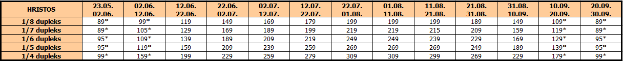 U slučaju spajanja smena na organizovanom prevozu, cena aranžmana za drugu smenu se umanjuje za 35 eur po osobi, osim za smene koje su u tabeli označene zvezdicom (*) gde se u slučaju spajanja smena cena umanjuje 25 € po osobi.