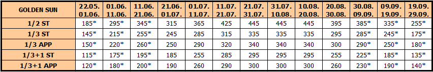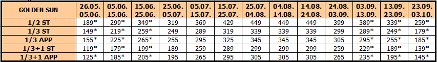 Cene označene zvezdicom* iskazane su po osobi i obuhvataju smeštaj i prevoz. U slučaju sopstvenog prevoza u smenama sa * cena se umanjuje za 20 eur po osobi od ukupne vrednosti aranžmana.