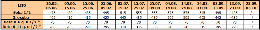 Ukoliko deca od 0 do 10,99 godina uz dve punoplative osobe koriste sopstveni ležaj u sobi 1/2+1, plaćaju po cenovniku za 3.osobu.