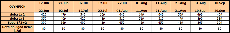 * Dvoje dece do 4,99 godina, u pratnji dve punoplatežne osobe u trokrevetnom apartmanu, mogu da koriste jedan zajednički ležaj i plaćaju po 50% cene smeštaja.