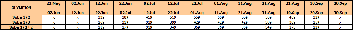 Cene su u Eur, po osobi, najam za 10 noćenja (usluga noćenje sa doručkom)