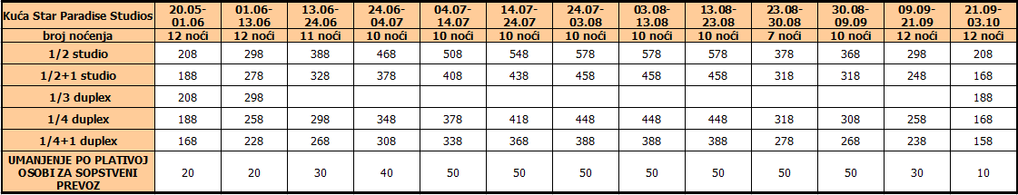 Cene iz tabele predstavljaju cenu paket aranžmana (smeštaj + prevoz) po osobi.