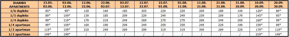 U slučaju spajanja smena na organizovanom prevozu, cena aranžmana za drugu smenu se umanjuje za 35 eur po osobi, osim za smene koje su u tabeli označene zvezdicom (*) gde se u slučaju spajanja smena cena umanjuje 25 € po osobi.