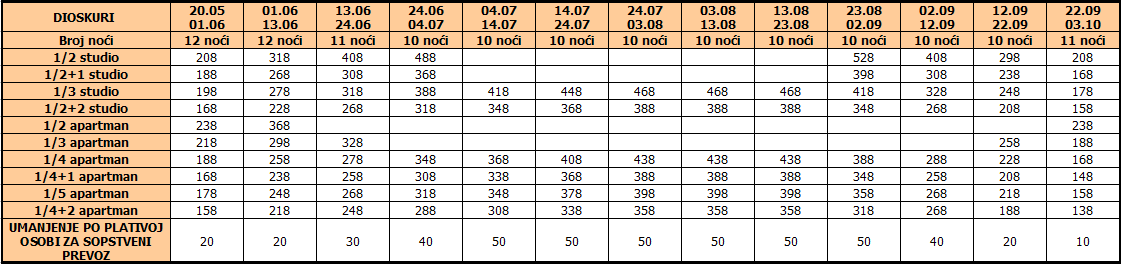 Cene iz tabele predstavljaju cenu paket aranžmana (smeštaj + prevoz) po osobi.