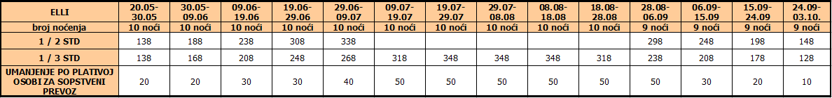 Cene iz tabele predstavljaju cenu paket aranžmana (smeštaj + prevoz) po osobi.