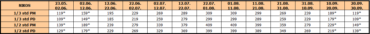 U slučaju spajanja smena na organizovanom prevozu, cena aranžmana za drugu smenu se umanjuje za 35 eur po osobi, osim za smene koje su u tabeli označene zvezdicom (*) gde se u slučaju spajanja smena cena umanjuje 25 € po osobi.