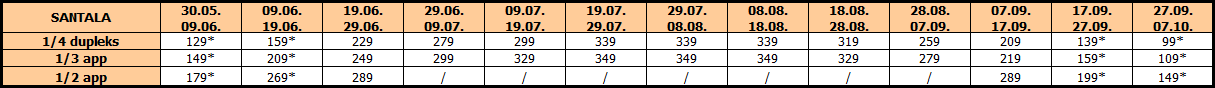 U slučaju spajanja smena na organizovanom prevozu, cena aranžmana za drugu smenu se umanjuje za 40 eur po osobi, osim za smene koje su u tabeli označene zvezdicom (*) gde se u slučaju spajanja smena cena umanjuje 30 € po osobi.
