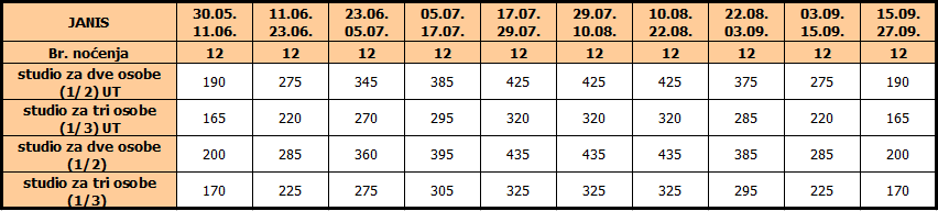 • Ukoliko dete do 12 godina koristi vlastiti ležaj, plaća cenu iz tabele umanjenu za 20€