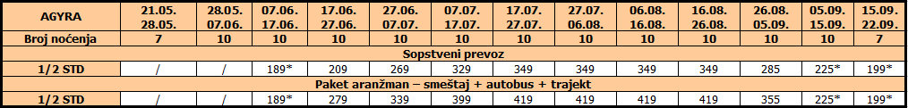 Termini označeni * čine paket aranžman (smeštaj + autobuski prevoz + trajekt) i nemaju umanjenje za sopstveni prevoz