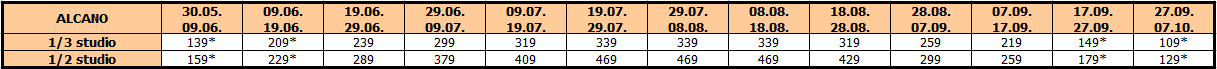 U slučaju spajanja smena na organizovanom prevozu, cena aranžmana za drugu smenu se umanjuje za 40 eur po osobi, osim za smene koje su u tabeli označene zvezdicom (*) gde se u slučaju spajanja smena cena umanjuje 30 € po osobi.