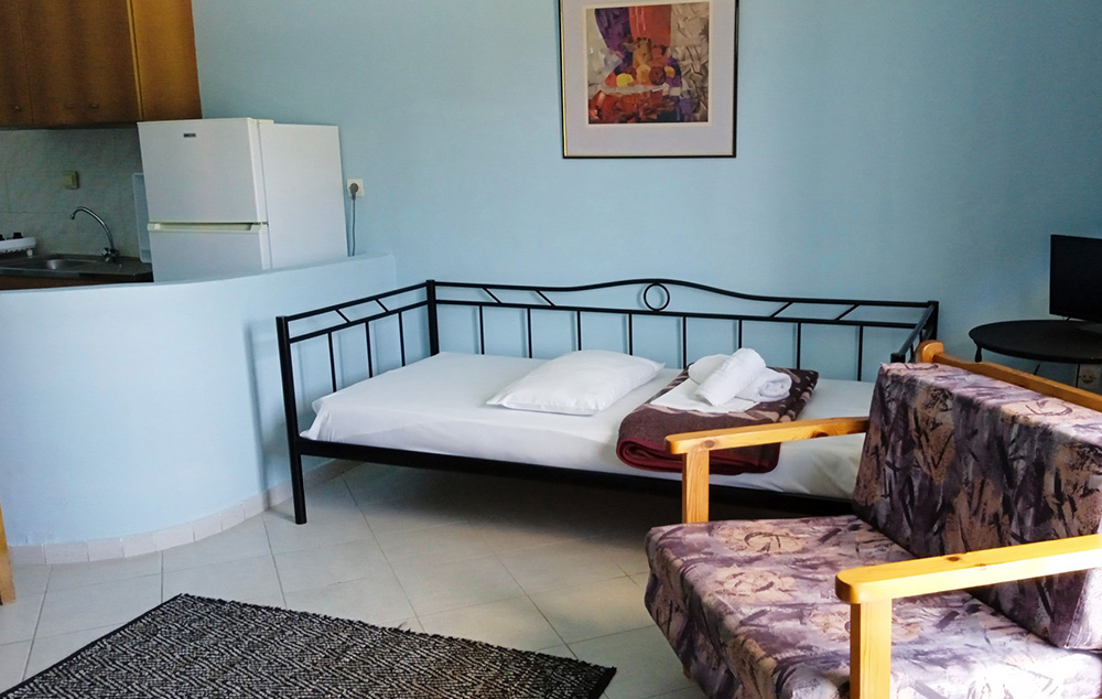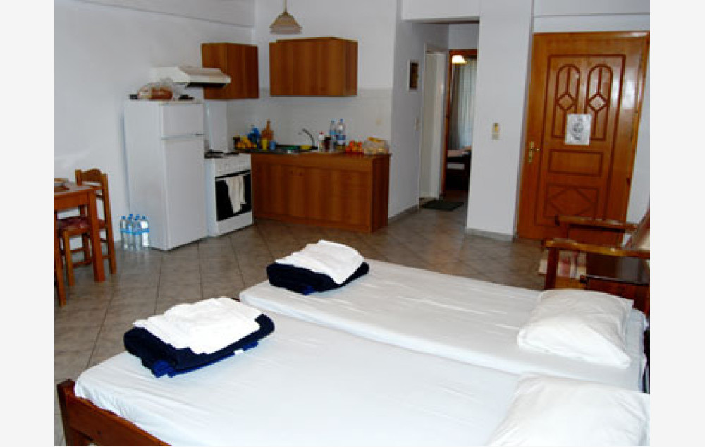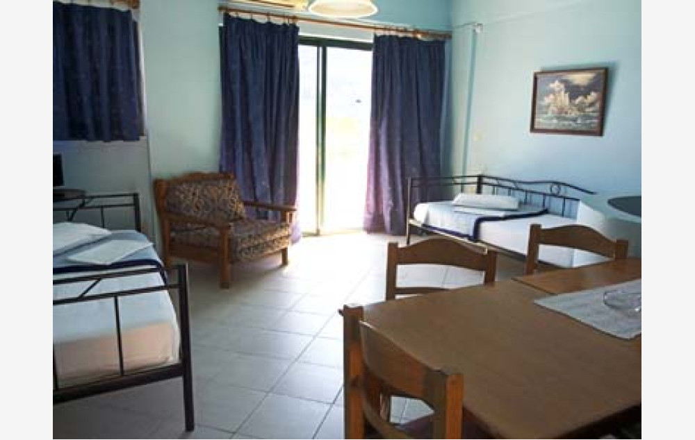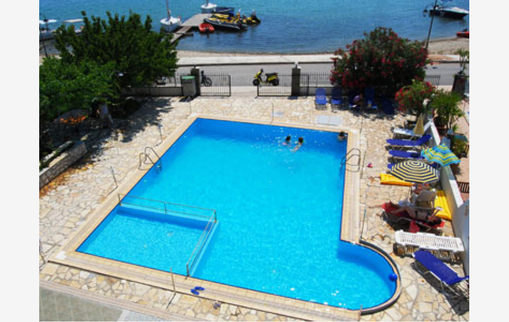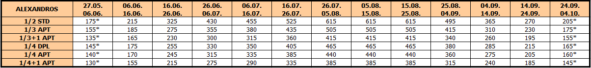 Vila Alexandros se nalazi na samoj obali, u pešačkoj zoni uz more, na svega stotinjak metara od centra i uz more, na oko 600 metra od najbliže, gradske plaže. Ono što ovu vilu posebno izdvaja, to je da ima lep, veliki bazen sa delom za decu i što svi studiji i apartmani imaju pogled na more i bazen. Dvokrevetni studio se nalazi na prizemlju, sa ulazom kroz terasu sa pogledom na bazen. Sastoji se od opremljene kuhinje, dela za spavanje sa dva standardna ležaja, kupatila i terase sa garniturom za sedenje i direktnim izlazom na bazen. Veličina studija je cca 18 kvm + terasa. Trokrevetni + 1 apartman se nalazi na prizemlju, sa ulazom kroz terasu sa pogledom na bazen. Sastoji se od opremljene kuhinje sa trpezarijom, u kojoj se nalazi ležaj za odraslu osobu iz kojeg se izvlači manji ležaj na kojem može spavati dete do 12 godina, spavaće sobe sa dva standardna ležaja ili francusakim, kupatila i terase sa garniturom za sedenje. Veličina apartmana je cca 25 kvm + terasa. Na prvom i drugom spratu se nalaze trokrevetni, četvorokrevetni i četvorokrevetni + 1 apartmani koji se sastoje od spavaće sobe sa dva ležaja ili manjim francuskim, dnevnog boravka sa opremljenom kuhinjom, dva ležaja ili manjim francuskim + fotelja na otvaranje (za dete do 6 godina), kupatila i dve terase. Na drugom spratu se nalazi četvorokrevetni dupleks apartmani koji se sastoje od dve spavaće sobe sa dva ležaja i manjim francuskim, opremljene kuhinje, dva kupatila i dve terase. Veličina apartmana je cca 30, a dupleksa cca 36 kvm + terase. Svi apartmani vile Alexandros su opremljeni TV-om, wi – fi Internetom i klima uredjajem (uz doplatu na licu mesta (opcija) 8 eura dnevno), a u kuhinjama se nalaze mali šporet ili samo rešo sa dve ringle. Vila Alexandros je B kategorije, starijeg datuma, odlično održavana i nema mogućnost sopstvenog parkinga.