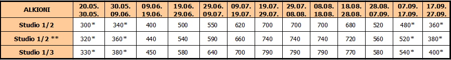 VILA ALKIONI se nalazi uz obalu mora, u mirnom kraju, u neposrednoj blizini plaže na oko 100m udaljenosti. Raspolaže dvokrevetnim i trokrevetnim studijima sa kuhinjom-nišom (kompletno opremljena sa posuđem, dve ringle, frižider), kupatilom (tuš kada,WC, lavabo sa ogledalom), terasama ( duboka lođa ) koje gledaju na more, TV i AC. Gostima je na raspolaganju WI-FI internet ( agencija nije odgovorna za kvalitet i brzinu ), jedan peškir po osobi. Upotreba klime nije uključena u cenu i plaća se na licu mesta 5 EUR dnevno. Promena posteljine i peškira vrši se na svakih pet dana. Neki od studija su kompletno renovirani u 2024.godini .