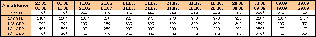 Za sopstveni prevoz cena aranžmana se umanjuje za 30€ po osobi, a 20€ za smene označene ZVEZDICOM (*)