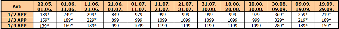 U slučaju spajanja smena na organizovanom prevozu, cena aranžmana za drugu smenu se umanjuje za 25€ po osobi osim za smene koje su u tabeli označene zvezdicom (*).