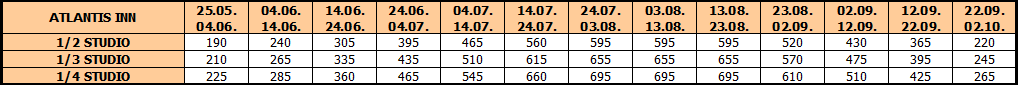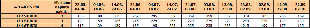 Cene u tabeli su izražene na bazi najma po studiju/apartmanu za 10 noćenja.