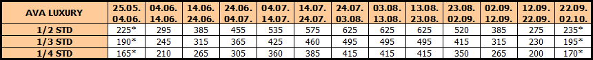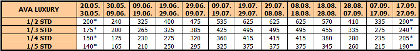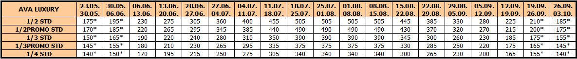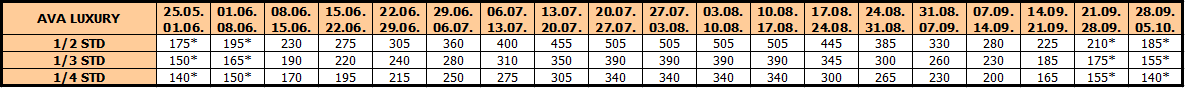 Opis: Vila je u potpunosti renovirana 2020. Poseduje studija namenjena za smeštaj dve, tri, četiri ili pet osoba. Smeštajne jedinice se nalaze na prizemlju, prvom, drugom ili trećem spratu, a svaka od njih ima opremljen kuhinjski deo, kupatilo/wc, terasu, TV, WiFi internet i klima uređaj (uključen u cenu aranžmana).Posteljina se menja na polovini boravka. Po svojoj poziciji, komforu, opremljenosti, vila Ava Luxury je objekat visokog kvaliteta i kao takav najtraženiji, a preporuka je za sve kategorije turista. Vila poseduje ograničen broj parking mesta uz doplatu (100€ za 10 noćenja, odnosno 70€ za 7 noćenja).