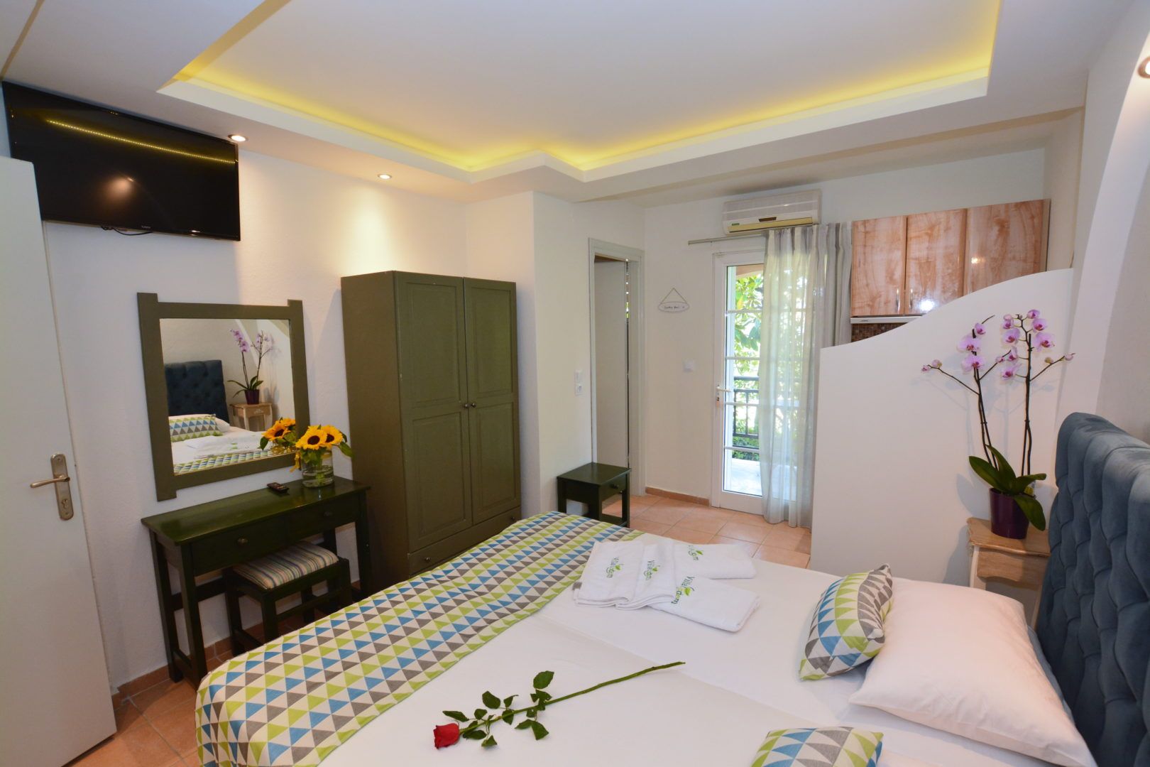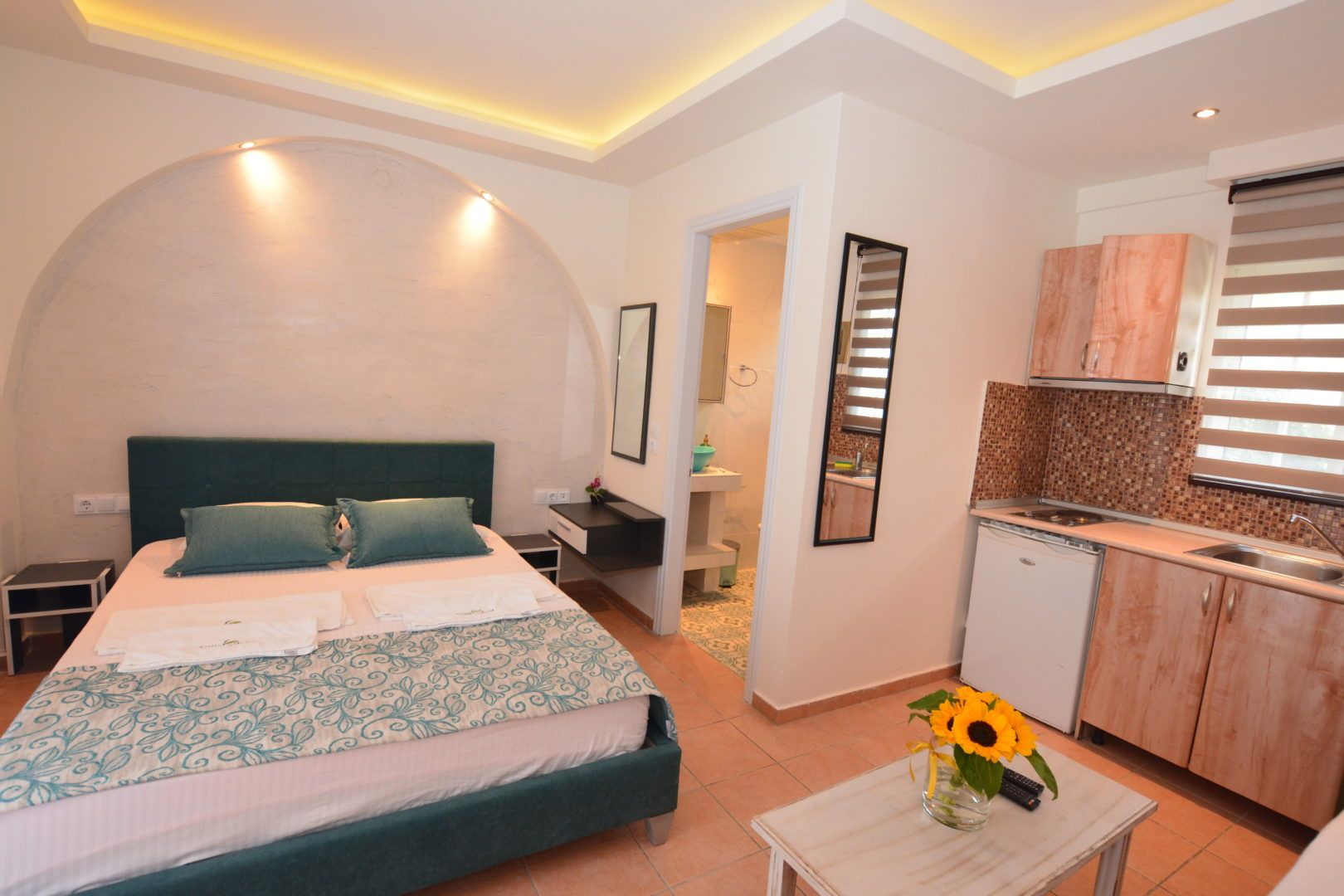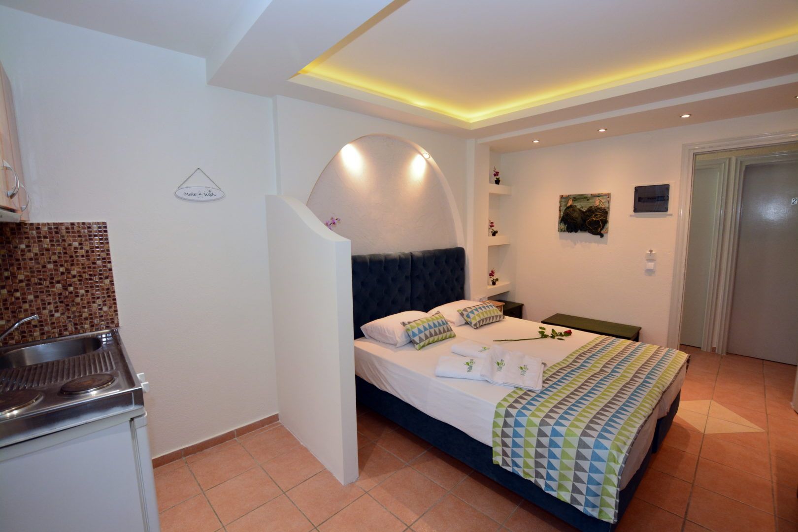 DVOKREVETNI STUDIO: Dvokrevetni studio u svom sastavu poseduje francuski ležaj ili dva singl ležaja, ormar, noćni stočić, TV sa lokalnim kanalima, klima uređaj i kuhinjski deo sa rešoom sa dve ringle i frižiderom. Kupatila su ili sa tuš kabinom ili zavesom ili otvorenim prostorom za tuširanje. Svaka soba ima svoju zasebnu terasu sa stolom i dve stolice.