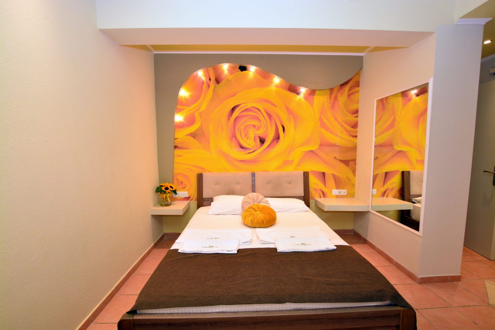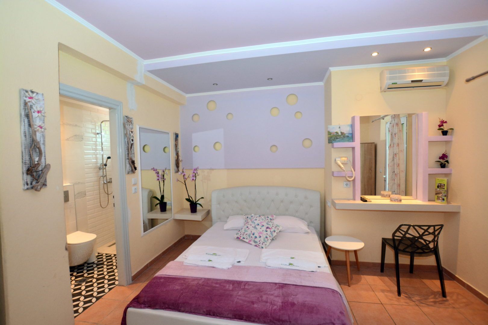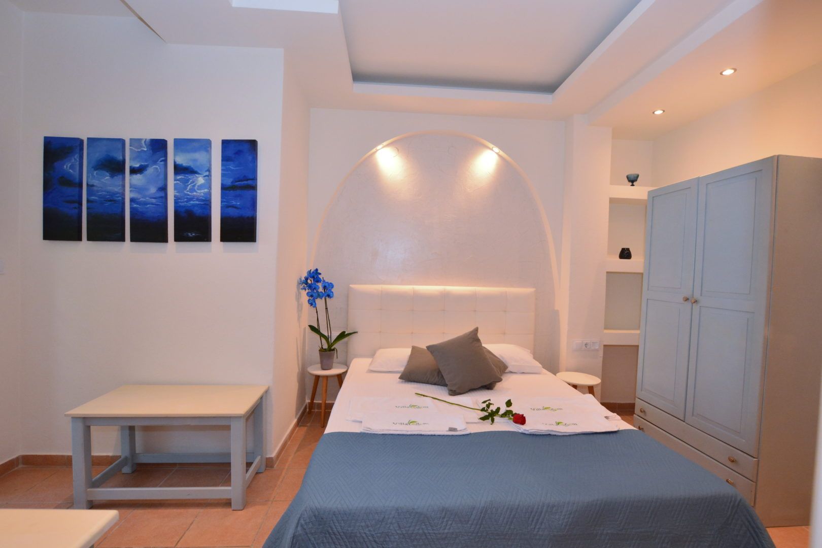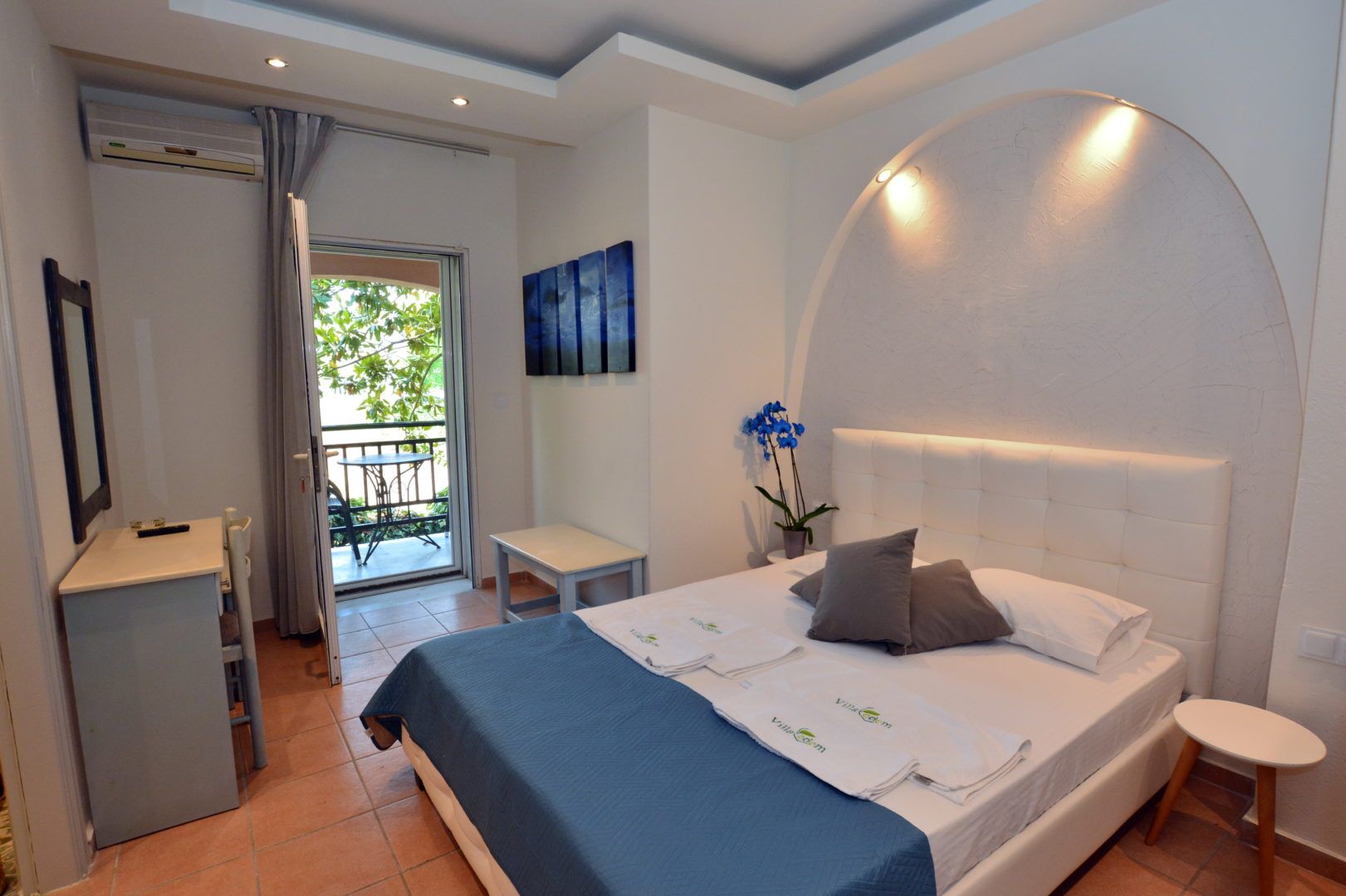 DVOKREVETNI STUDIO: Dvokrevetni studio u svom sastavu poseduje francuski ležaj ili dva singl ležaja, ormar, noćni stočić, TV sa lokalnim kanalima, klima uređaj i kuhinjski deo sa rešoom sa dve ringle i frižiderom. Kupatila su ili sa tuš kabinom ili zavesom ili otvorenim prostorom za tuširanje. Svaka soba ima svoju zasebnu terasu sa stolom i dve stolice.