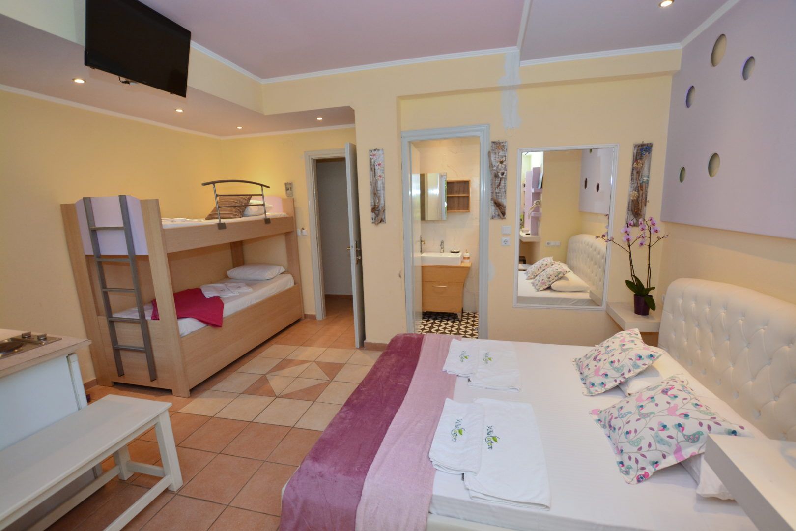 TROKREVETNI STUDIO: Trokrevetni studio u svom sastavu poseduje francuski ležaj ili dva singl ležaja i jedan singl ležaj ili sofu, ormar, noćni stočić, TV sa lokalnim kanalima, klima uređaj i kuhinjski deo sa rešoom sa dve ringle i frižiderom. Kupatila su ili sa tuš kabinom ili zavesom ili otvorenim prostorom za tuširanje. Svaka soba ima svoju zasebnu terasu sa stolom i tri stolice.