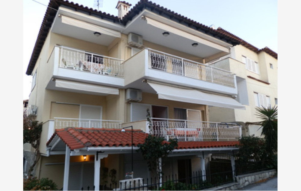 Vila Eleni, malo izvan centra (na oko 700 metara), na oko 140 metara od plaže u mirnom delu letovališta prema Haniotiju, na oko 150 metara od samoposluge Arvanitidis i Masutis. Apartmani Eleni se nalaze na visokom prizemlju i prvom spratu i sve terase imaju bočni pogled na more i tende na terasi. Četvorokrevetni + 1 apartman, sastoji se od sobe u kojoj je opremljena kuhinja (mali šporet sa rernom i frižider sa zamrzivačem) i jedan manji francuski ležaj, spavaće sobe sa dva standardna ležaja, kupatila sa ogradjenom tuš kadom i dve terase. Četvorokrevetni + 1 apartman – veći je nešto veći od prethodno opisanog i ima jednu veliku terasu sa lepšim bočnim pogledom na more. U apartmanima je na raspolaganju i pomoćni ležaj za dete do 12 godina. Veličina apartmana je cca 30 do 35 kvm + terasa. Apartman je opremljen jednim klima uredjajem (uključen u cenu), plafonskim ventilatorom u spavaćoj sobi, TV-om i wi – fi Internetom (uključen u cenu). Vila Eleni je B + kategorije, nema peškire i nema mogućnost sopstvenog parkinga.