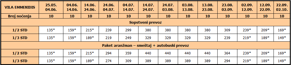 Cene iz tabele su izražene u evrima po osobi na bazi 10 noćenja