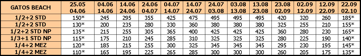 – Pomoćni ležaj za osobe starije od 6 godina – 4. osoba u studiju 1/3+1 i 6. osoba u mezoneti 1/4+2 plaća 85 € + autobusku kartu (osim u smenama označenim * kada se plaća samo autobuska karta).