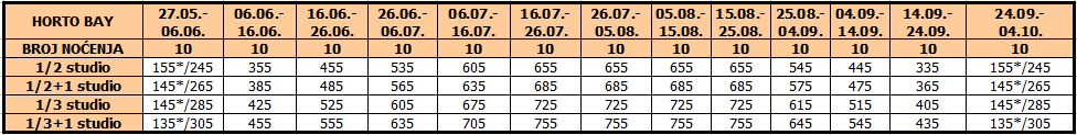 Cene su izražene u eurima po studiju/apartmanu na bazi najma za 10 noćenja