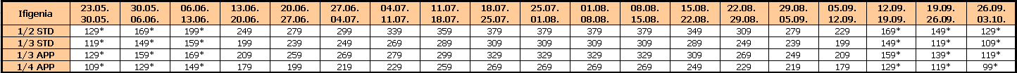 Za sopstveni prevoz cena aranžmana se umanjuje za 30€ po osobi, a 20€ za smene označene ZVEZDICOM (*)