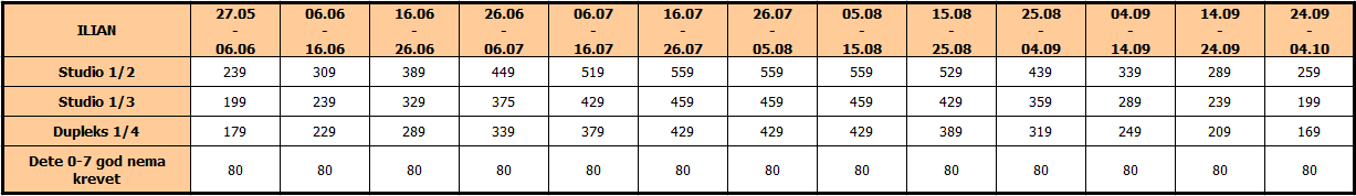 Cene u tabeli su izražene u eurima po osobi, na bazi 10/11 noćenja sa autobuskim prevozom.