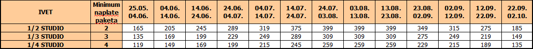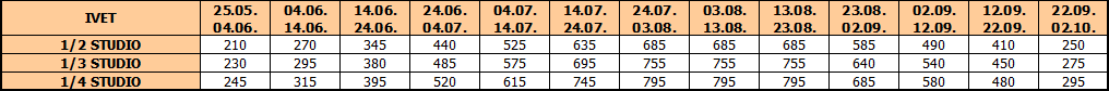 Cene u tabeli su izražene na bazi najma po studiju/apartmanu za 10 noćenja.