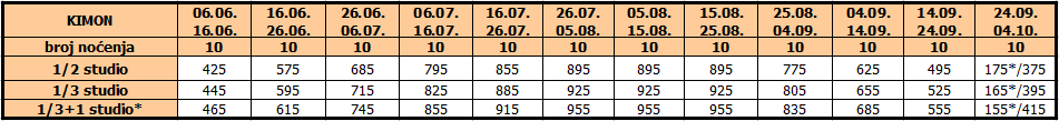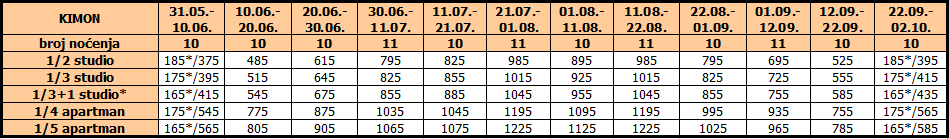 Cene su izražene u eurima po studiju/apartmanu na bazi najma za 10 noćenja