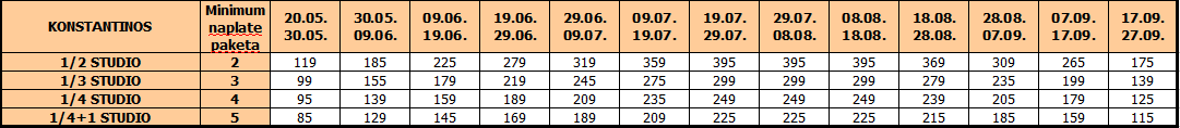 Cene u tabeli su izražene na bazi najma po studiju/apartmanu za 10 noćenja.