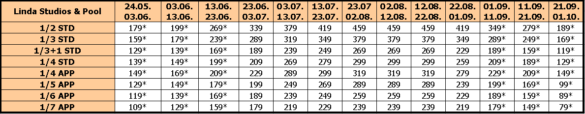 U ponudi imamo dvokrevetne, trokrevetne i četvorokrevetne studije, kao i sedmokrevetni apartman. Sve jedinice nalaze se u prizemlju, na prvom, drugom i trećem spratu. Manje su kvadrature, pa iz tog razloga mogu primiti onoliki broj dece i odraslih koliko ima kreveta.