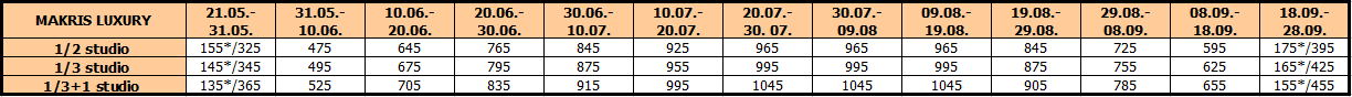 Vila Makris Luxury je jedan od najluksuznijih objekata u ponudi letovališta Leptokarija. Objekat je moderan i najsavremenije arhitekture, a o tome najbolje govori sam izgled ovog objekta, kako spoljni, tako i unutrašnji. Svi studiji su veoma komforni, opremljeni najkvalitetnijim, modernim nameštajem. Svaki poseduje mini kuhinju, kompletno opremljenu, kupatilo sa tuš kabinom, flat-screen TV, telefon, klima uređaj, fen za kosu,Wi Fi i terasu.