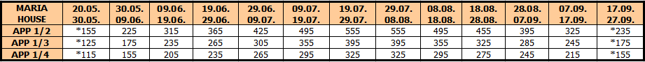 Cene su izražene u evrima po studiju / apartmanu, najam za 10 noćenja