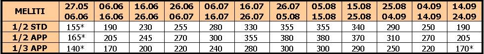 – U slučaju spajanju smena, cena se umanjuje za 30€ (jun i jul) i 40€ (avgust i septembar)po osobi na ukupnu cenu paket aranžmana, osim u smenama označenim zvezdicom.