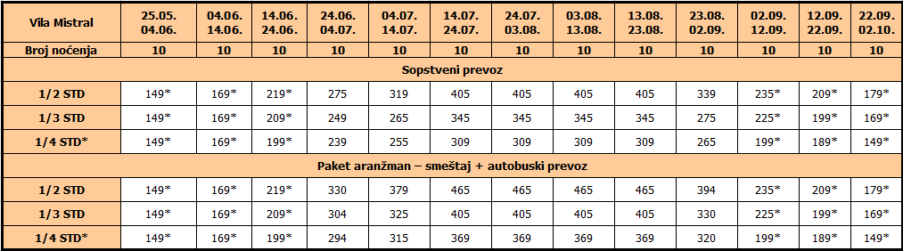 Cene iz tabele su izražene u evrima po osobi na bazi 10 noćenja