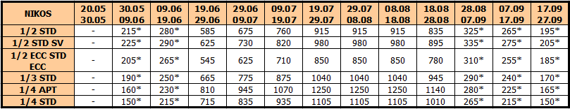 *Cene označene zvezdicom * su cene paket aranžmana u VANSEZONI (uračunat smeštaj i autobuski prevoz iz Niša, bez teritorijalne doplate za prevoz) po osobi.* Teritorijalna doplata za autobuski prevoz severno od Niša: Beograd – 10 evra, Novi Sad – 20 evra
